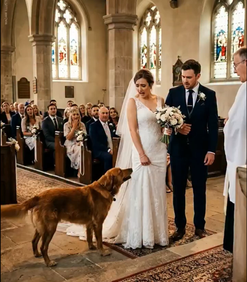 Moments later, the dog stood up abruptly and began barking loudly. The sharp sound echoed through the church, interrupting the ceremony and startling the guests. Conversations stopped instantly, and all eyes turned toward the unexpected source of the disturbance.