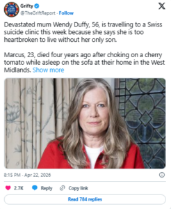 Public reaction to Wendy Duffy’s case has been mixed, with some people expressing sympathy for her grief and others raising ethical concerns about assisted dying in cases that are not related to terminal physical illness. The debate reflects ongoing discussions in several countries about how law and medicine should approach severe psychological suffering and end-of-life autonomy.